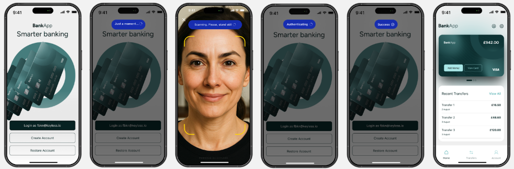 * **Live enrollment:** Keyless provides a User Interface (UI) to create a biometric template, which future authentication attempts will be compared to. This involves capturing their facial biometrics and device details. Our passive liveness technology will also ensure the user is a real person.
